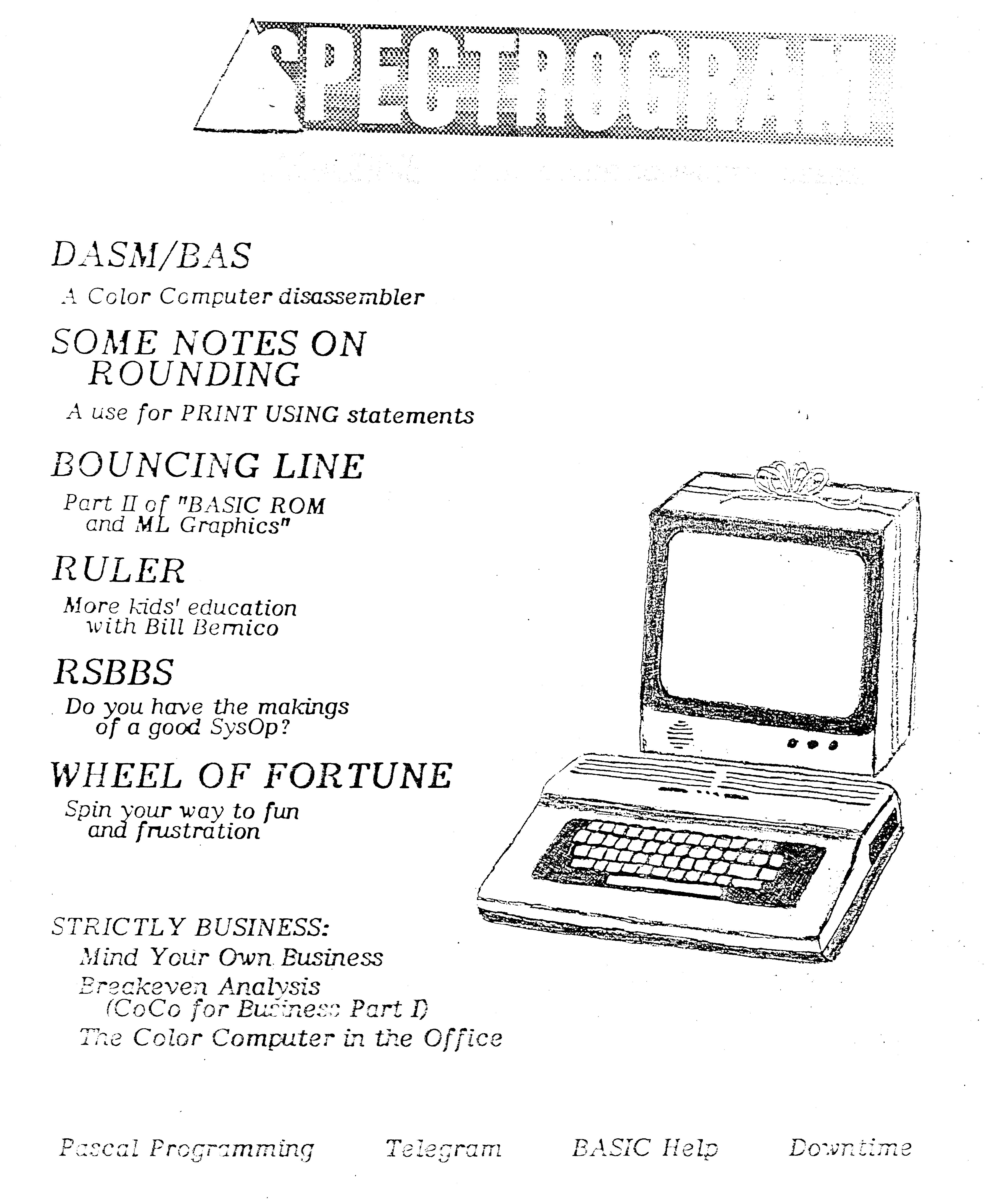 Spectrogram magazine cover for January 1987. A Color Computer with a monitor wrapped in a bow.