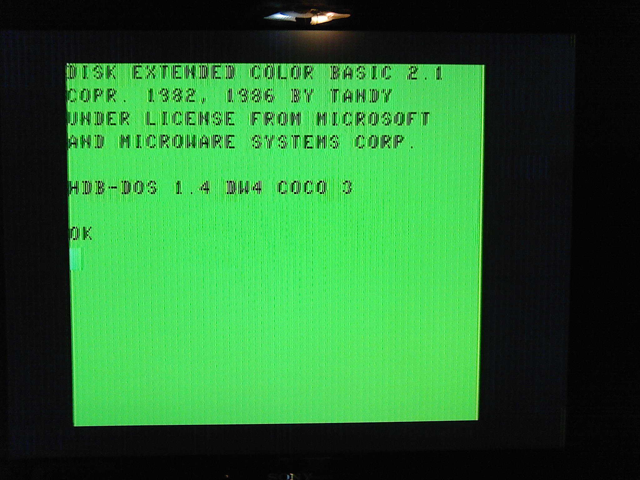 Initial Coco 3 boot screen with the HDB-DOS v1.4 DW4 Coco3 rom image burned into a 2764 installed in the first eprom slot of the Disto Super Controller.