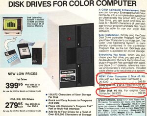 When the CoCo 2 was first introduced in 1984, Tandy also released a new floppy drive that seems only to have worked with the CoCo 2 and not the CoCo 1. This was the Color Computer 2 Disk #0 Kit, Cat. No. 26-3029, as shown in RSC-10 p.50, which specifically says: "Use with our new Color Computer 2". The catalog still offered the 26-3022, of which it says: "For original Color Computer." Was this merely an aesthetic issue - a gray exterior vs. the new white exterior? I doubt it, since during the gray-to-white transition Radio Shack sometimes kept the same catalog number for the older gray and newer white products (like the CCR-81), and the CoCo 1 in RSC-10 had a white case. The same distinction between CoCo 1 and CoCo 2 drives was made in RSC-11 p. 54, but the CoCo 1 drive was dropped in 1985's RSC-12. Maybe the CoCo 2 drive worked with the CoCo 3 when that came out, meaning there should also be a CoCo 2/3 platform tag?