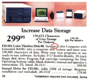 Either way, by the time the CoCo 3 came out in 1986 (in the RSC-17 for 1987), Radio Shack had already stopped offering either of those floppy drives in favor of the horizontally-oriented and Tandy-branded "Color Thinline Disk Drive" which stated it was for "any Color Computer with Extended BASIC" which can only mean this drive, unlike perhaps the 26-3029, was hardware compatible with the CoCo 1 as long as that CoCo 1 had Extended BASIC.